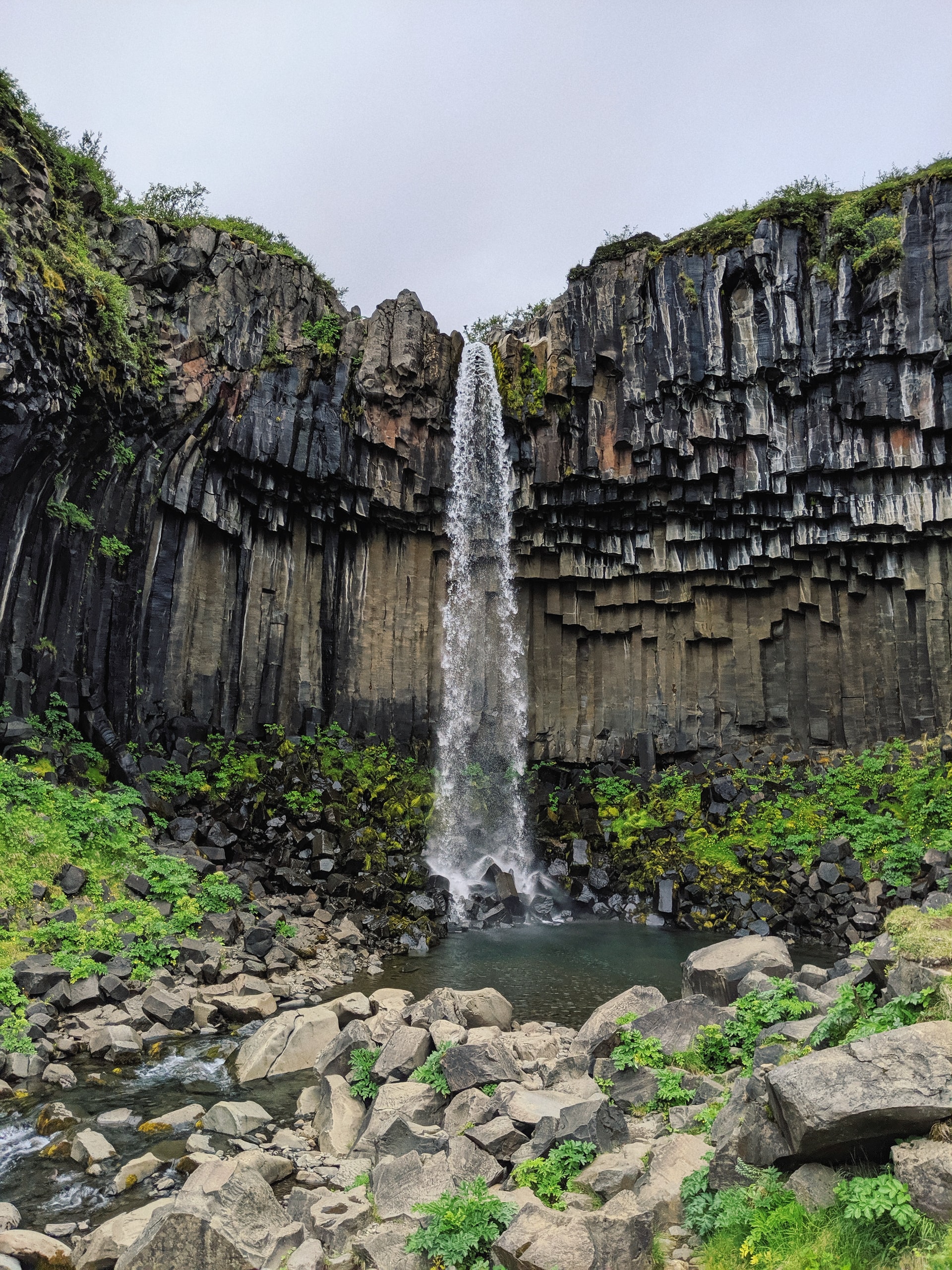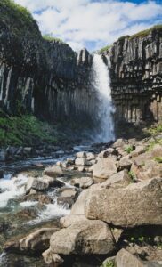 A waterfall in Skaftafell. It is surrounded by dark lava columns. Make sure it is on your bucket list!